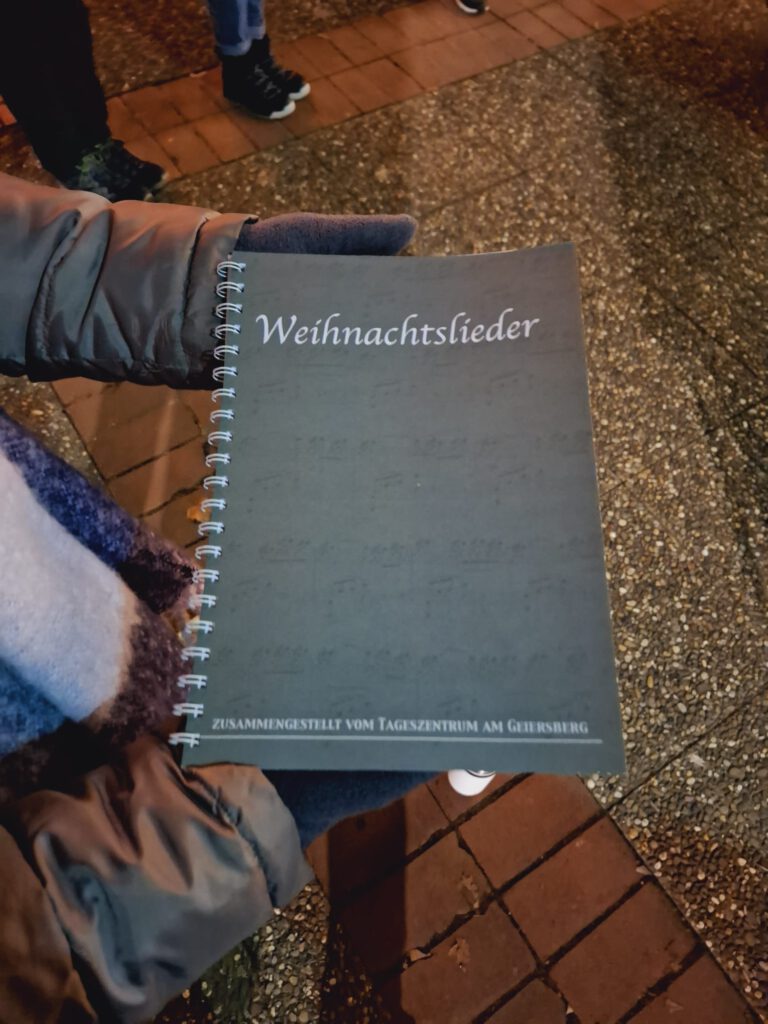 Und so schallte es ganze vierzig Minuten weihnachtlich durch den gesamten Borner Grund – textsicher dank der ausgeteilten Liederhefte. Welche Lieder gesungen wurden entschied der Zufall: Britta hatte zusammengefaltete Zettel in eine kleine Box gesteckt, aus der sich die Besucherinnen und Besucher die nächste Liedernummer ziehen konnten.