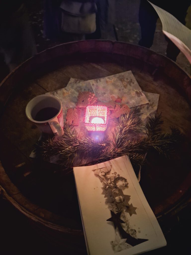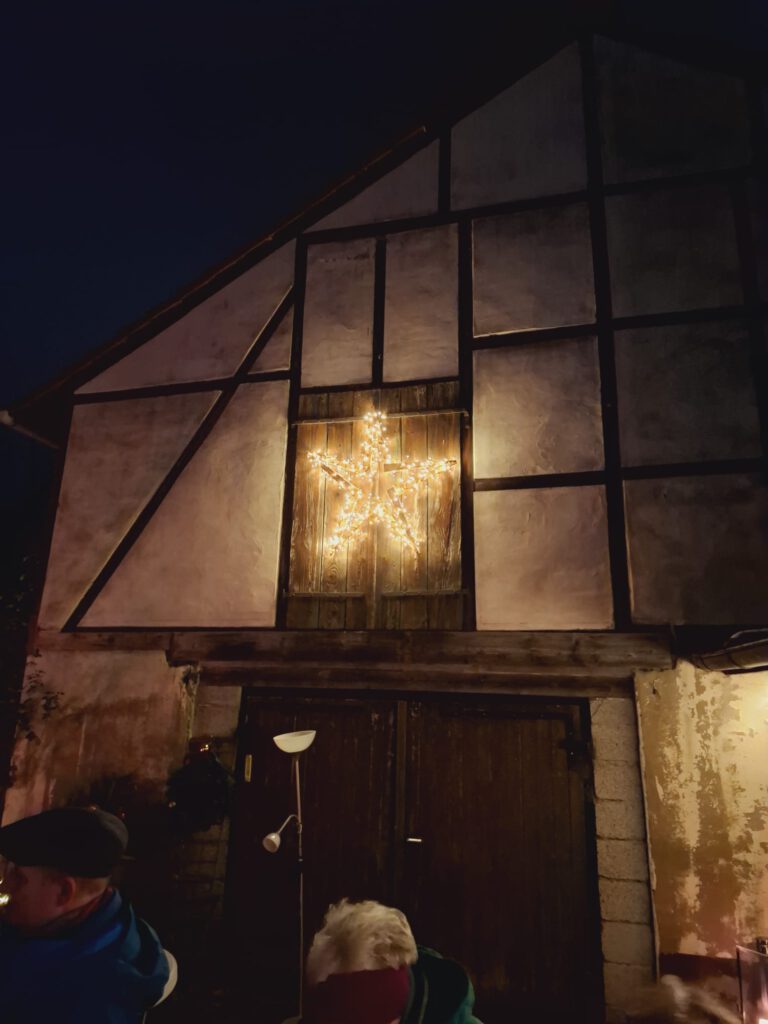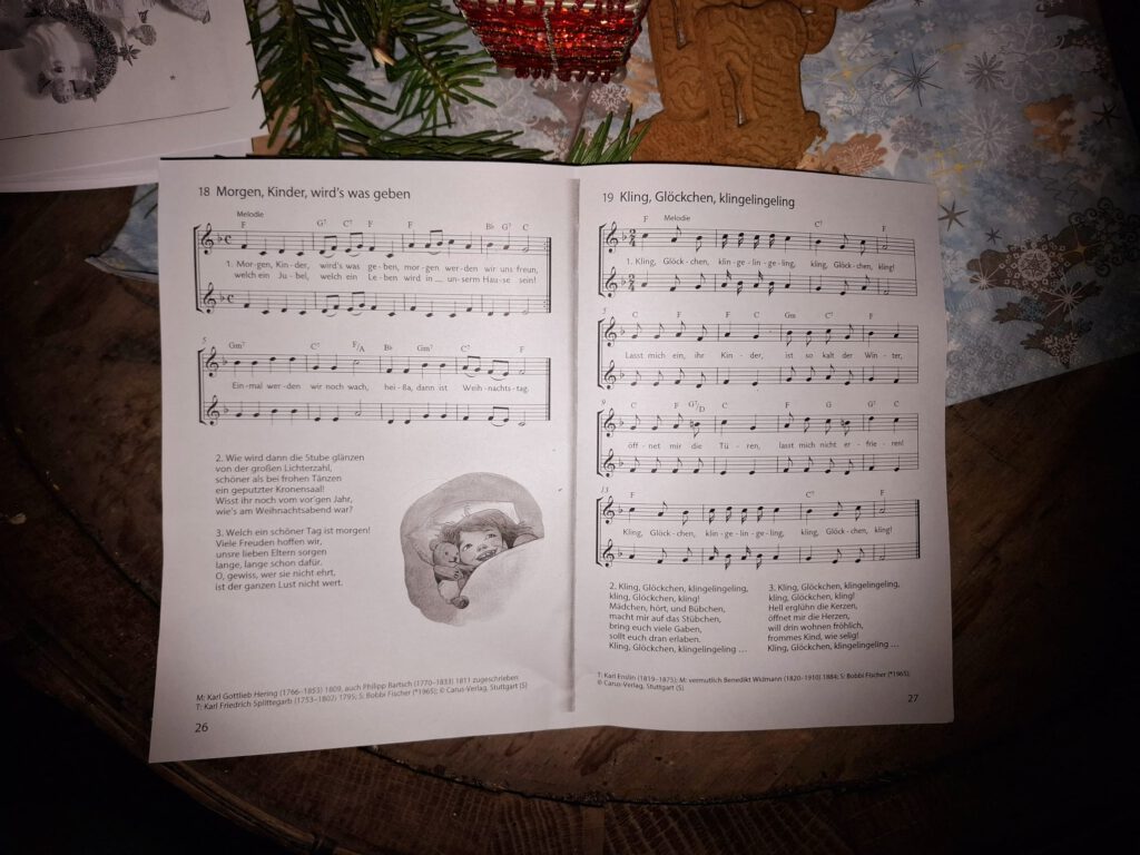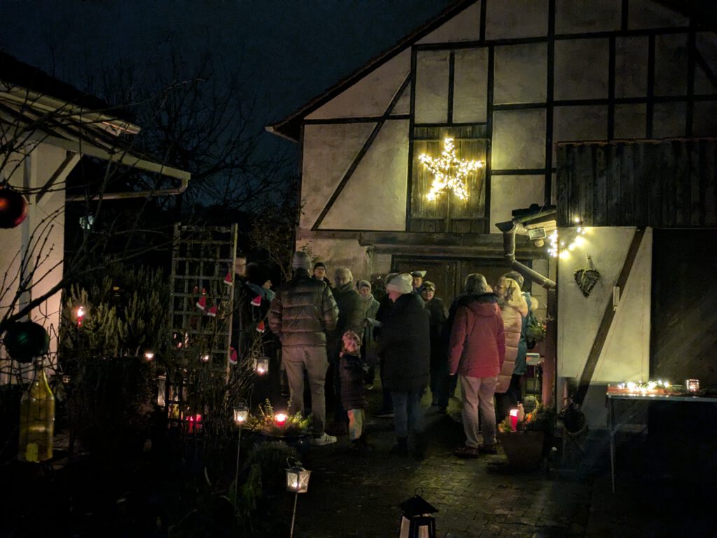 Heute lud Familie Altenkirch in ihren wunderbar illuminierten Garten ein. Neben einer von Elke in Mundart vorgelesenen Geschichte wurden zwei Kinder-Weihnachtsliedklassiker, Morgen Kinder wirds was geben und Kling Glöckchen vom Publikum gesungen.