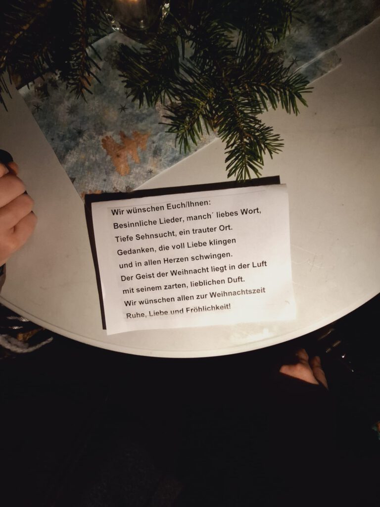 Euren Weihnachtswunsch geben wir gerne zurück und bedanken uns bei euch für den schönen Abend.