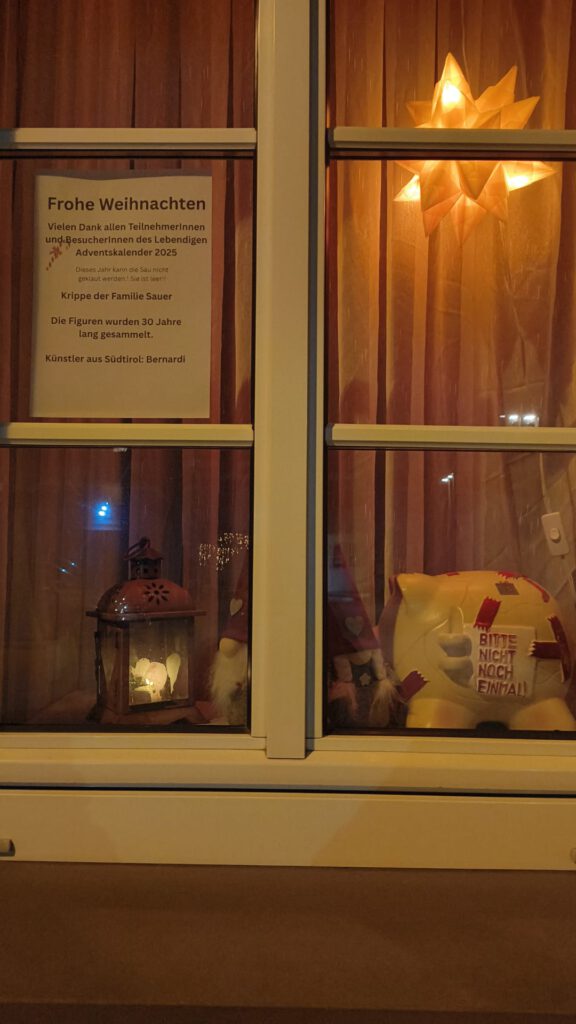 In einem weiteren Fenster standen Flyersau und Laternchen, die beiden Wandersymbole des Adventskalenders unter Verschluss… und ja, dass Britta sich besonders über den Raub der Sau am vergangenen Heiligabend geärgert hatte, kann jeder sichtbar nachlesen.