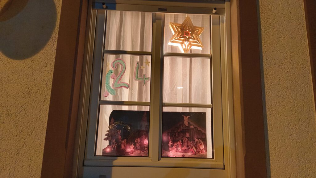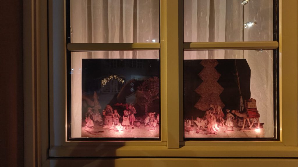 Nach der schönen Krippe, die bei Türchen Nr 12 gezeigt wurde, hatte Familie Sauer entschieden, auch ihre Krippe einmal zu zeigen. Da sie nicht am Fenster aufgebaut werden kann, wurde sie fotografiert und als Bild ins Fenster gestellt. Es handelt sich um eine Krippe aus bemalten Holzfiguren. Erschaffen hat sie ein Künstler aus Südtirol namens Bernadi. Die Figuren wurden über 30 Jahre hinweg gesammelt. Leider werden sie nicht mehr produziert. Britta wünscht viel Freude beim Entdecken der Kleinigkeiten.